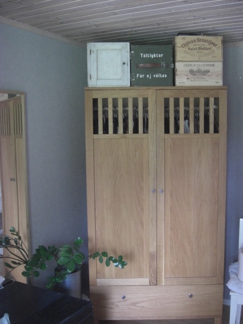 I väntan på "kuddbilder" tänkte jag visa ett hörn i sovrummet. Det är fortfarande lite kaos där inne sen jag gjorde om min klädkammare till pysselrum, men det ska väl snart bli lite ordning. Ovanpå garderoben placerade jag ett litet skåp som jag verkligen gillar. Det är litet och kvadratiskt men väldigt långt. Jag undrar verkligen vad det en gång använts till!? Det är ganska slitet och sen råkade jag stänga dörren och nu går den inte att få upp... Men jag gillar det ändå!